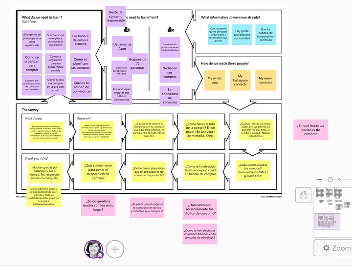 Para profundizar, elaboré un Lean Survey Canvas y diseñé una encuesta precisa. La difundí por WhatsApp, Instagram Stories y LinkedIn. Mucha gente se animó a colaborar (¡gracias de nuevo si estás leyendo esto!). Además, realicé al menos nueve entrevistas más para entender mejor la motivación y hábitos de las personas respecto a su alimentación.